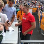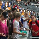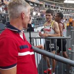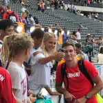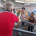 Das Highlight war allerdings der Speerwurf der Männer. Es ist schon imposant, wenn so ein Speer fast 90 m in der Luft fliegt. Auch konnte man gut erkennen, dass manche Speere, bei denen man nach dem Abwurf dachte, dass die weit hinter der Qualifikationslinie landen, plötzlich wie von Geisterhand vom Himmel steil runter fielen und weit vor dieser Linie stecken blieben. Unsere beiden Speerwurfasse Max und Marie Dehning schafften es, Fotos mit ihren Vorbildern Johannes Vetter und Thomas Röhler, die in der 2. Qualifikationsgruppe waren, zu machen.
