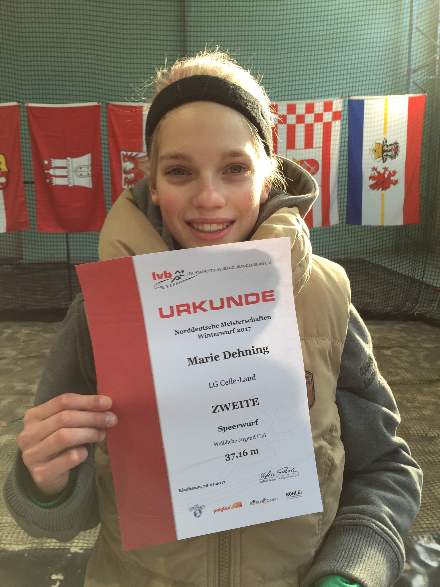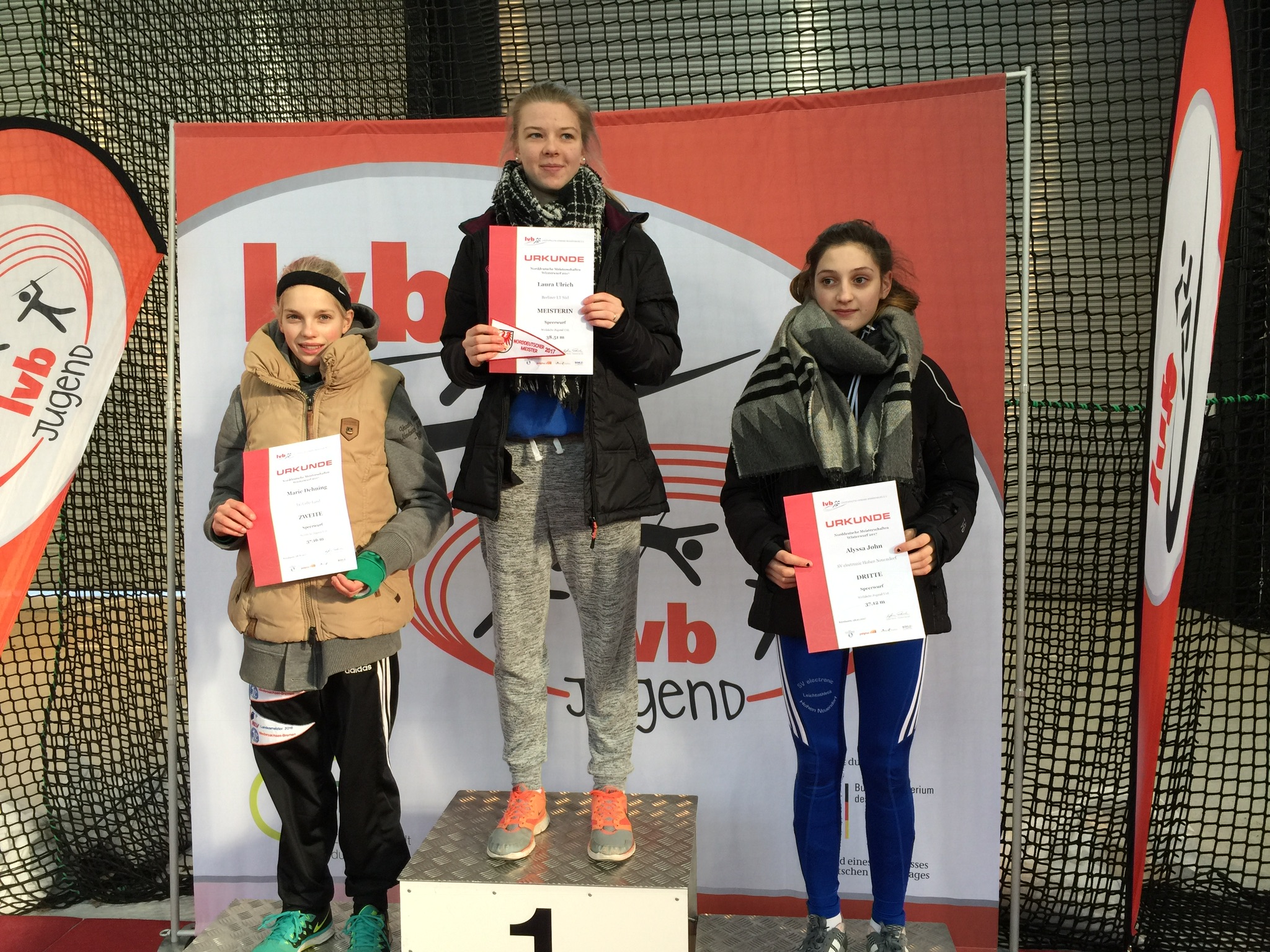 Am ersten Tag war zunächst Marie im Speerwurf an der Reihe. Bei Temperaturen knapp unter Null Grad hatten alle Teilnehmerinnen zu Beginn Schwierigkeiten, in den Wettkampf zu finden, doch Marie konnte im zweiten Versuch das erste Ausrufezeichen setzen und warf sich mit 35,07m im zweiten Versuch an die Spitze des Feldes. Im vierten Versuch steigerte sich das Mehrkampftalent noch einmal auf 37,16m und konterte damit den Wurf von Alyssa John von der BB SV electronic Hohen Neuendorf, die direkt vor Marie mit 37,12m kurzfristig in Führung gegangen war. Nach einem technisch sehr guten und weiten fünften Versuch schien Marie ihre Führung noch einmal ausbauen zu können, doch
