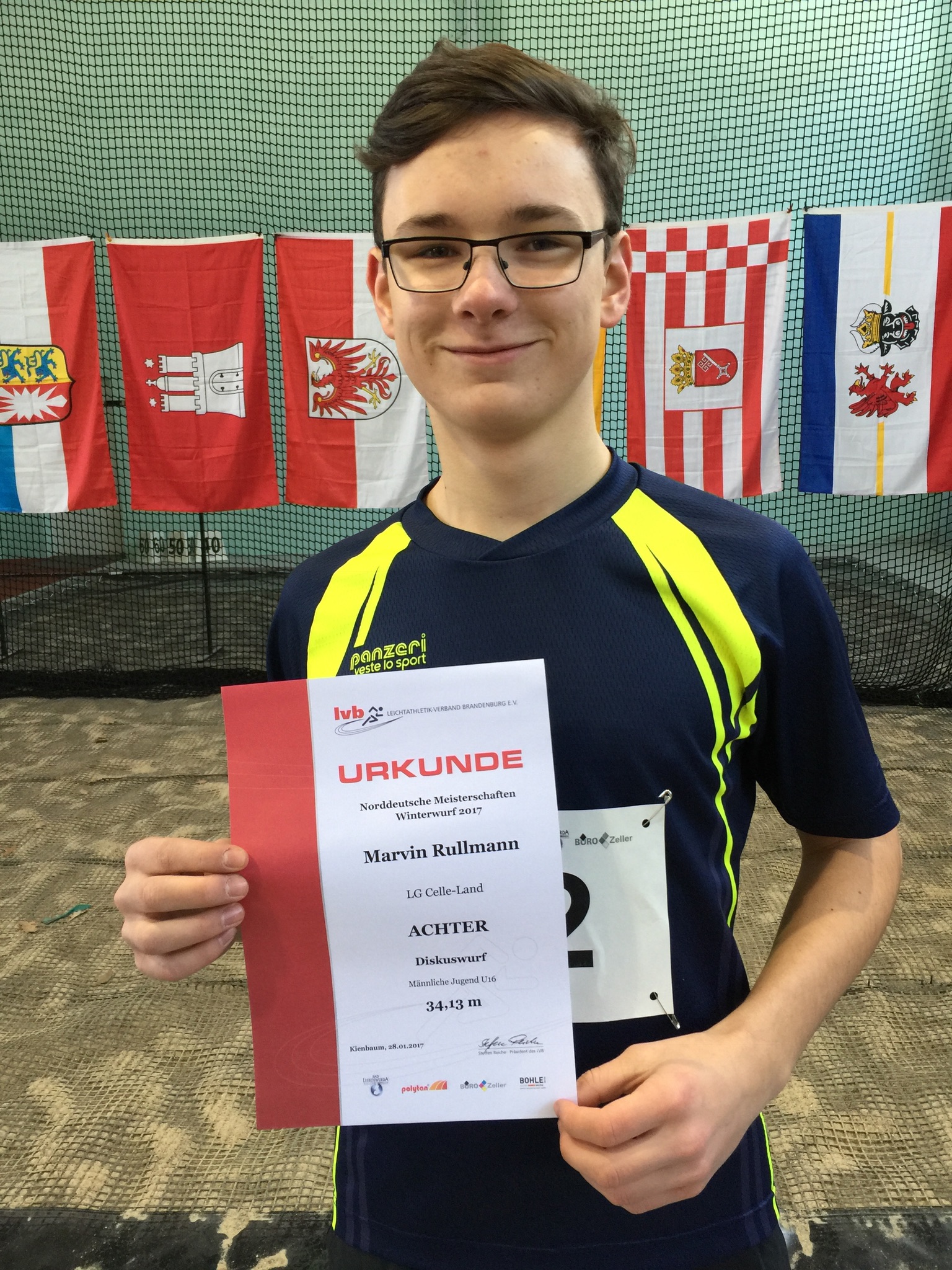 An Tag zwei dieser Meisterschaft stand für Marvin der Diskuswurf auf dem Programm. Bei ähnlich kalten Temperaturen wie tags zuvor begann Marvin den Wettkampf ebenfalls etwas holprig. Zum Endes des Vorkampfes im dritten Versuch gelang Marvin nach einer dynamischen Drehung und einem technisch guten Abwurf mit 34,13m seine beste Leistung des Tages. Zwar konnte das Wurftalent im vierten Versuch seine Rotationsgeschwindigkeit noch einmal etwas erhöhen, überdrehte den Abwurf aber leicht, sodass der Diskus knapp außerhalb des Sektors landete und somit leider ungültig war. Am Endes des Tages belegte Marvin nach dem zweitbesten Diskuswettkampf seiner Laufbahn einen wirklich tollen achten Platz bei seinen ersten Norddeutschen Meisterschaften