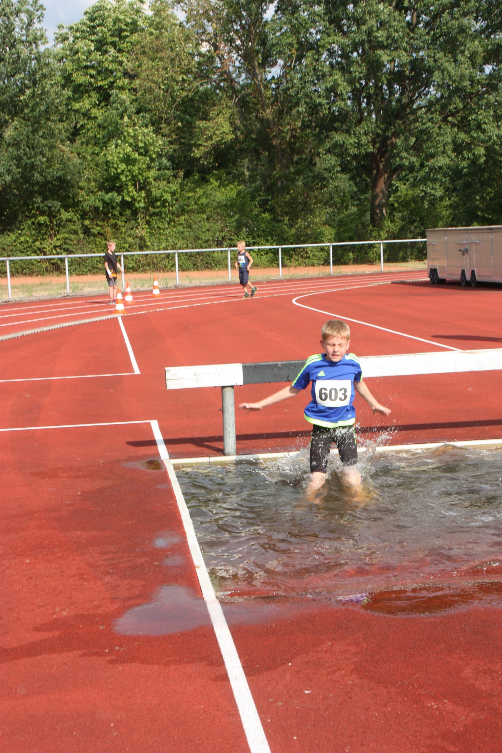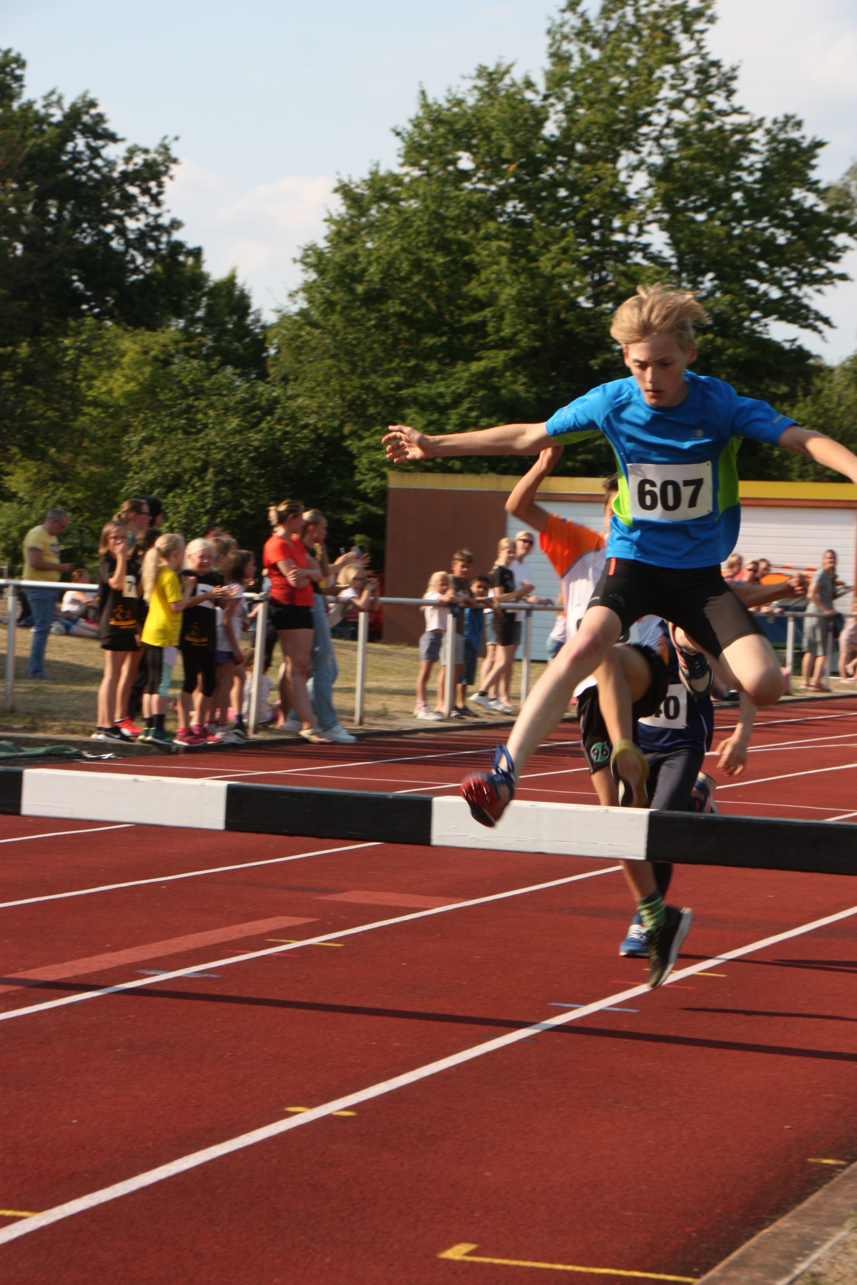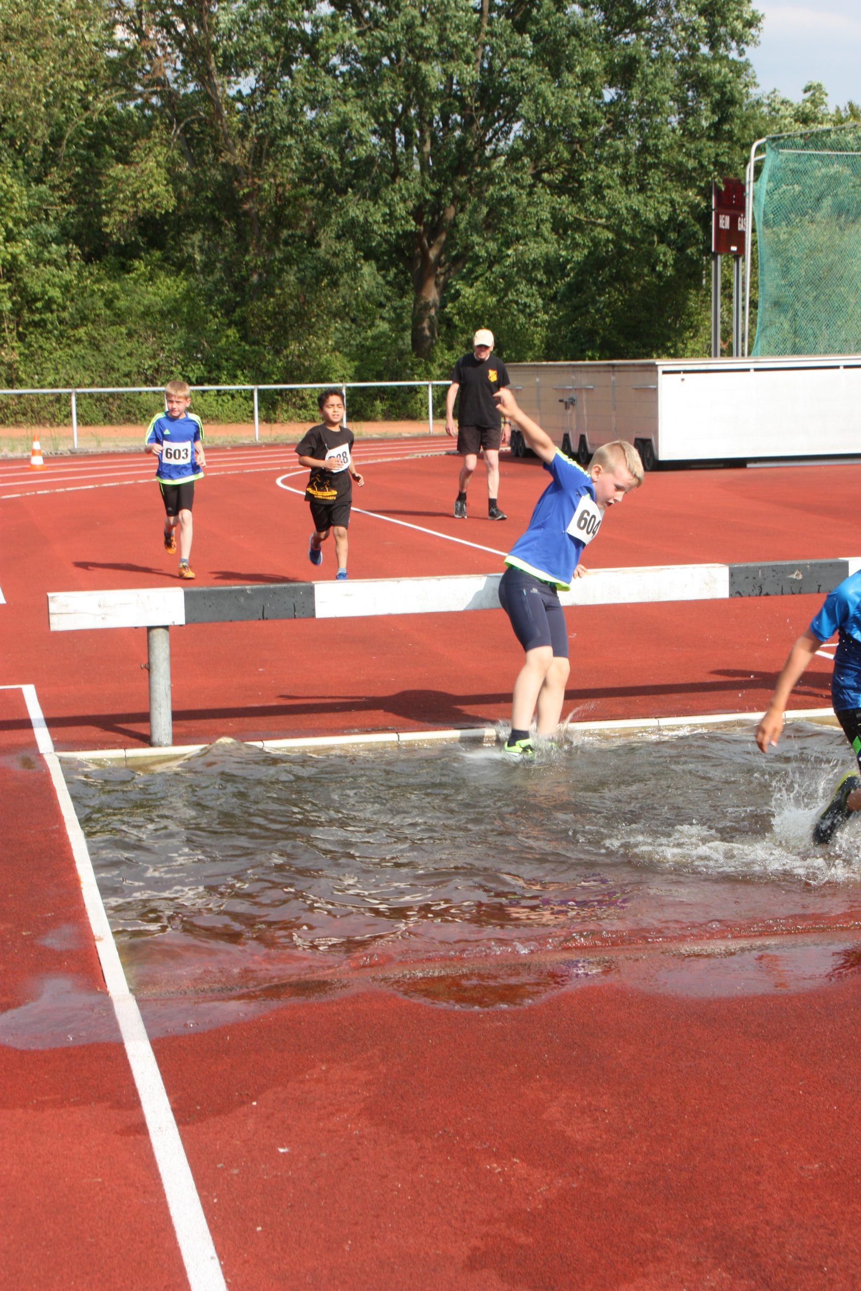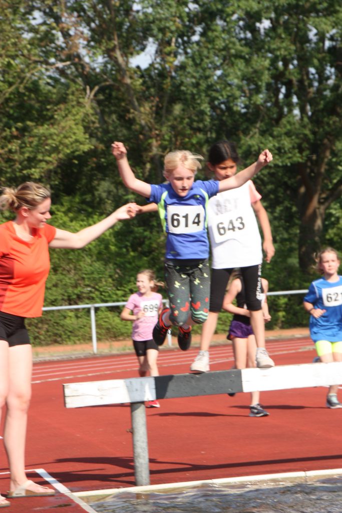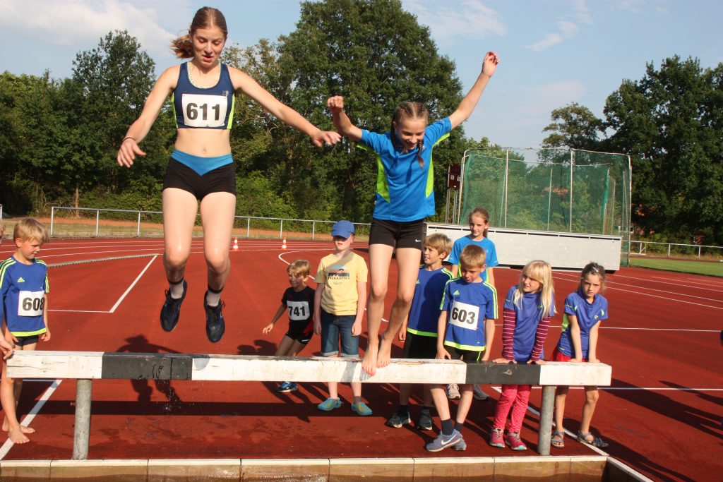 Noch nicht ganz. Die Leichtathletikabteilung des TuS Bergen hatte für ihre Schüler und Jugendlichen noch ein Highlight auf dem Programm. Wer Lust und Zeit hatte wurde angemeldet und dann gings los. Das Wetter war super für diese Art von Wettkampf, naß werden gehört hier dazu. Einmal über das Hindernis mit Wassergraben….. leichter gesagt als getan. Die jungen Athleten konnten hier hautnah erfahren, dass das, was im Fernsehen immer so leicht aussieht, am Ende hartes Training braucht. Aber hier stand der Spaß im Vordergrund und den hatten alle!