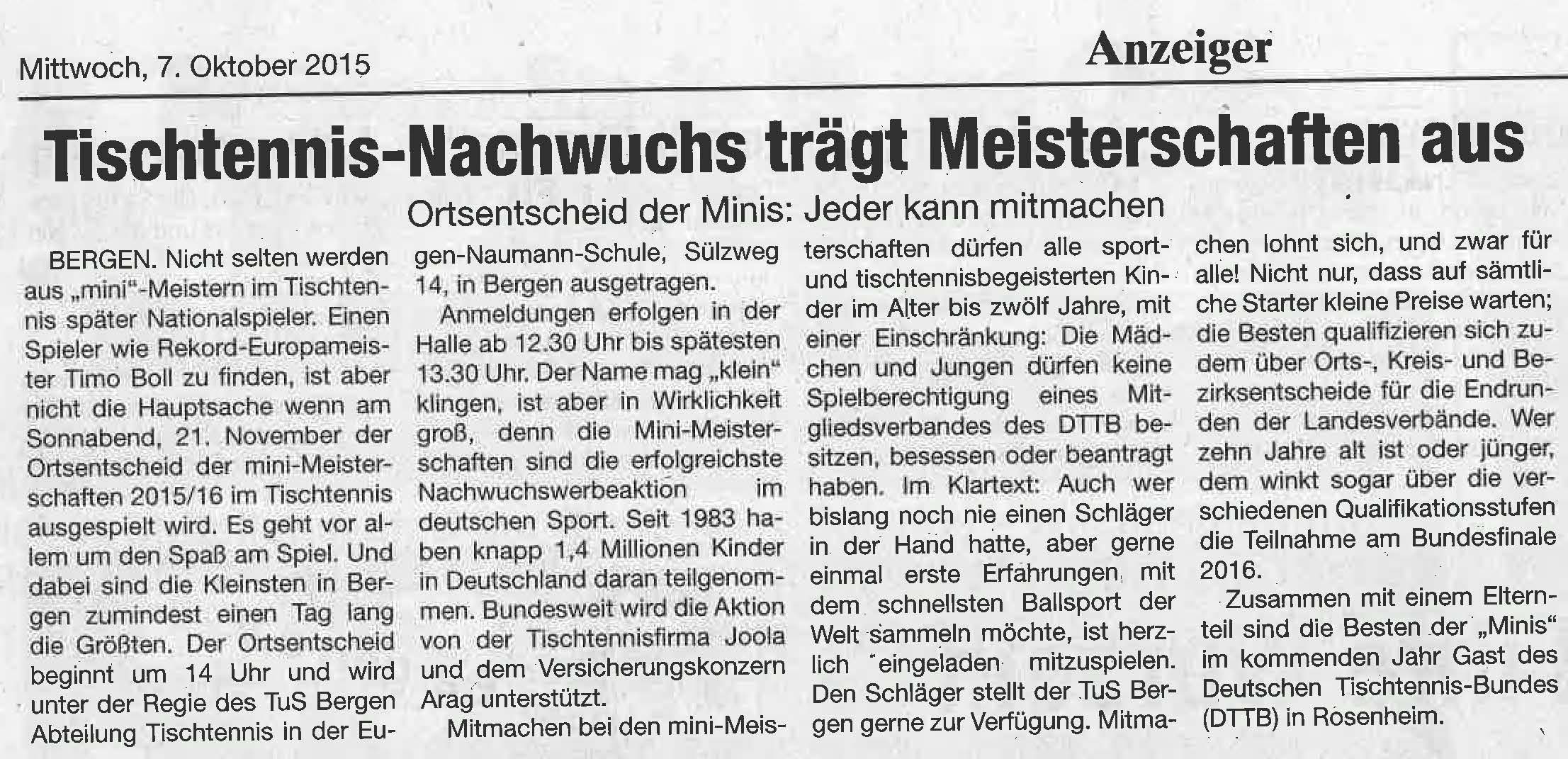 Am 21.11.2015 um 14:00 Uhr wird unter der Regie des TuS Bergen Abteilung Tischtennis in der Eugen-Naumann-Schule, Sülzweg 14, 29308 Bergen der Ortsentscheid der mini-Meisterschaften 2015/2016 im Tischtennis ausgespielt. Anmeldungen erfolgen in der Halle ab 12:30 Uhr bis spätesten 13:30 Uhr. Der Name mag „klein“ klingen, ist aber in Wirklichkeit groß, denn die mini-Meisterschaften sind die erfolgreichste Nachwuchswerbeaktion im deutschen Sport. Seit 1983 haben knapp 1,4 Millionen Kinder in Deutschland daran teilgenommen.