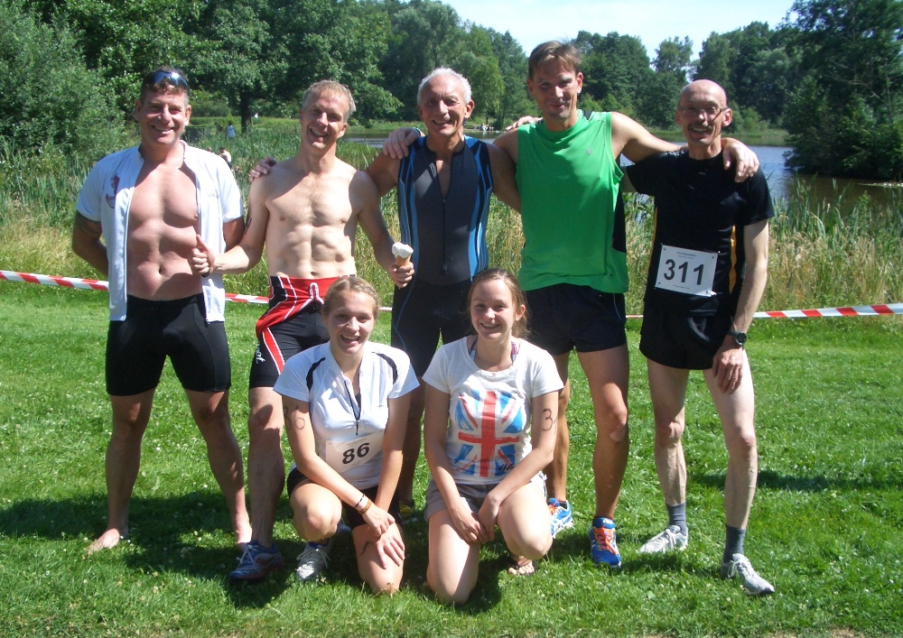 Unser Team beim Triathlon in Müden: vlnr:Rick Newmann, Stefan Bädermann, Horst Liedke, Tom Olshausen, Hans Röper, vorn: Stefanie Liedke, Carolin Liedke