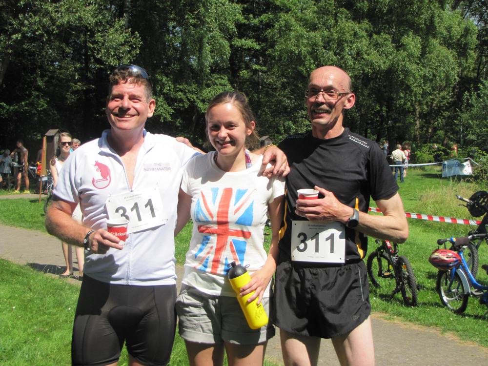 Das Siegerteam in der Mixed-Staffel: vlnr. Rick Newman (Rad), Carolin Liedke (Schwimmen) und Hans Röper (Laufen)